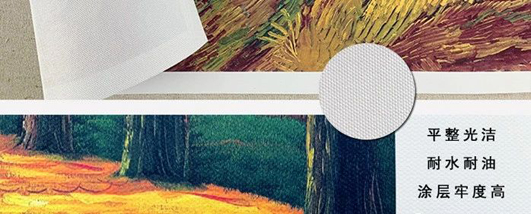此外,油畫布可用于X展架、易拉寶等展示器材的掛畫,也可用于舞臺(tái)背景,藝術(shù)照、婚紗照、室內(nèi)裝飾、展覽展廳會(huì)場(chǎng)布置、高檔油畫復(fù)制、商品展示背景、商業(yè)海報(bào)等等。
