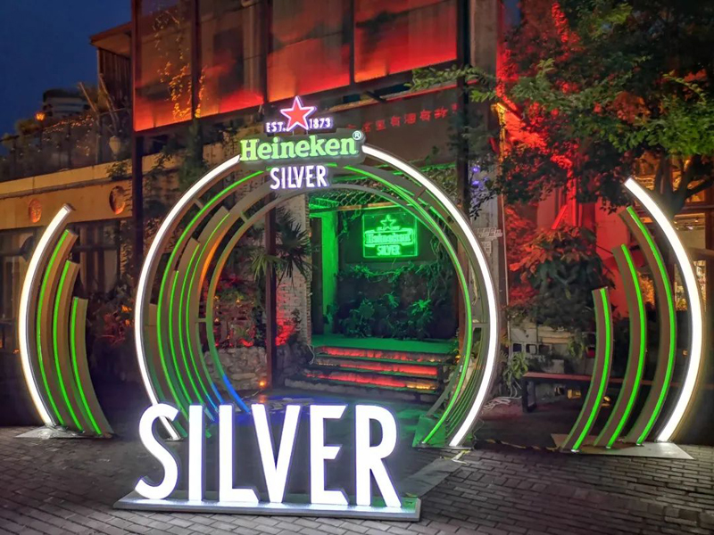 中間圓形結(jié)構(gòu),不銹鋼烤中銀亞光,正反面喜力綠色亞克力盒子霓虹燈帶發(fā)光;兩側(cè)采取同樣工藝,變換造型,底座采用內(nèi)置鋼板加重,確保其穩(wěn)定性。整體結(jié)構(gòu)協(xié)調(diào)性極好,發(fā)光效果極佳,色值準(zhǔn)確,使其完美落地。